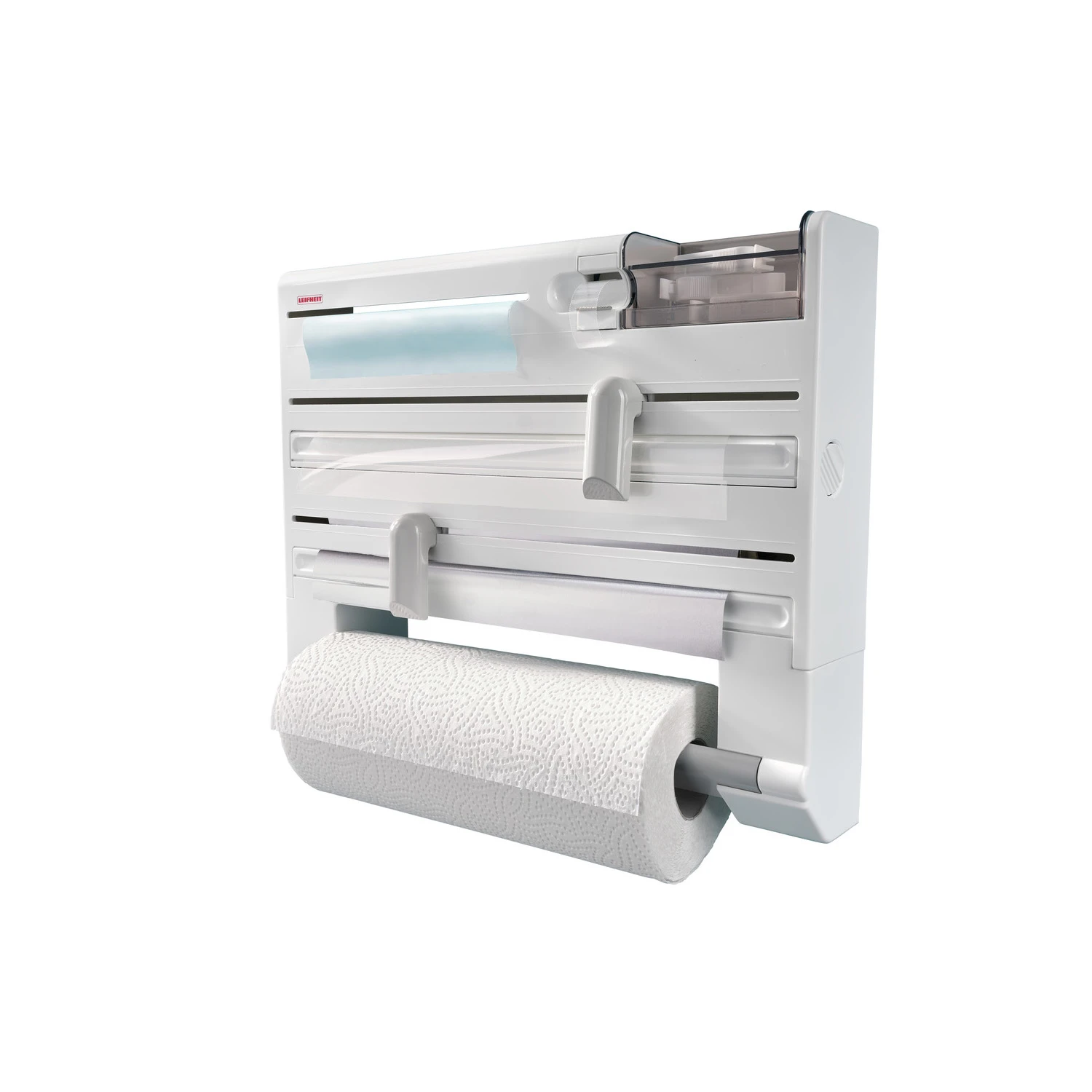 Al je huishoudfolie bij elkaar met de Leifheit Parat Plus keukenrolhouder wandmodel. De rollenhouder biedt plaats tot wel vier rollen. Aluminiumfolie, keukenpapier, huishoudfolie en zelfs diepvrieszakjes zijn handig in een apparaat opgeborgen. De keukenrolhouder Parat Plus is voorzien van vlijmscherpe snijschuivers die zorgen voor het eenvoudig afsnijden van foliën. De vlijmscherpe messen zijn veilig achter de ergonomisch gevormde snijschuivers weggewerkt, waardoor de Leifheit keukenhulp zorgeloos in gebruik kan worden genomen.