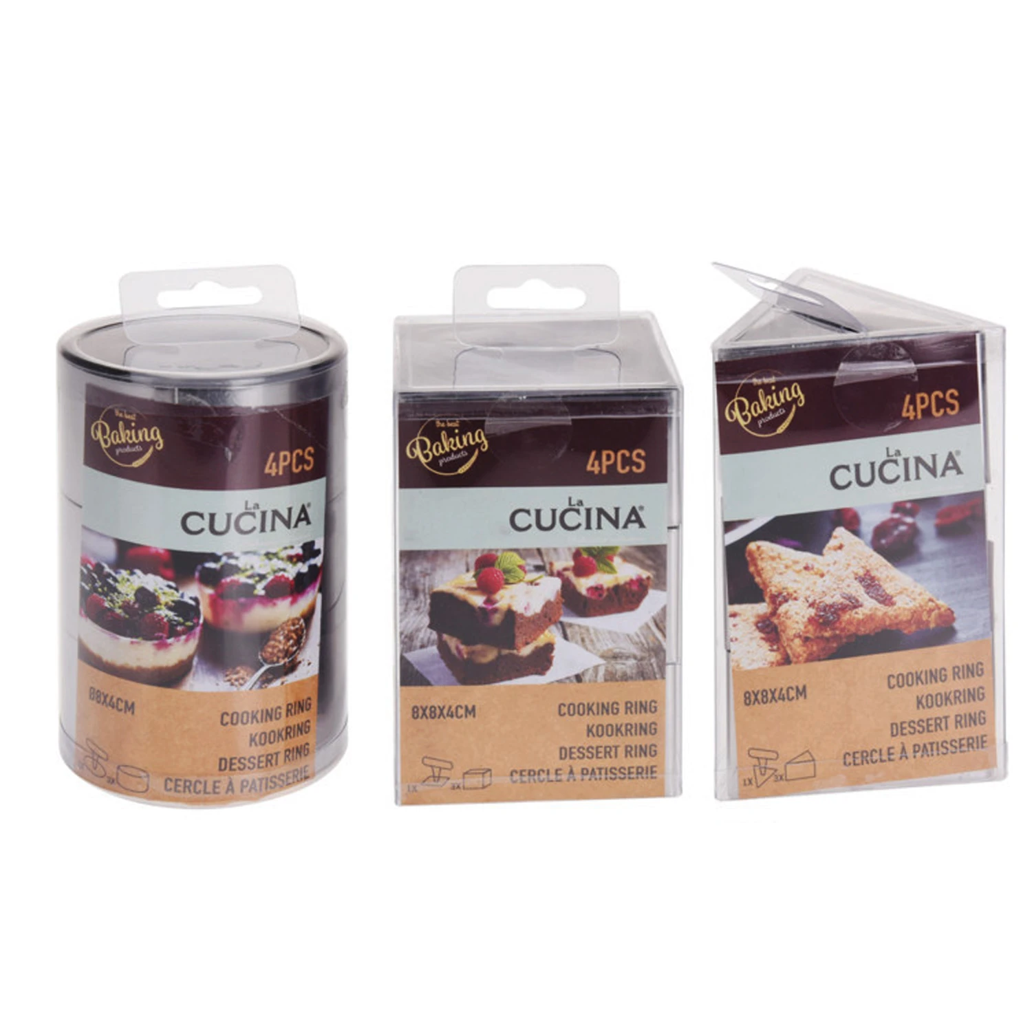 Deze 4-delige set bakringen is ideaal voor het serveren van maaltijden tijdens ontbijt, lunch, brunch en diner. Plaats bijvoorbeeld rijst in de vorm en duw hem aan met de deksel. Of bak er kleine cakejes in voor een mooie ronde, vierkante of driehoekige vorm. Na gebruik mogen de vormen in de vaatwasser. De set bestaat uit 3 ringen en 1 deksel. Het artikel is een assorti van 3 verschillende vormen. Het is een verrassing welke je ontvangt.