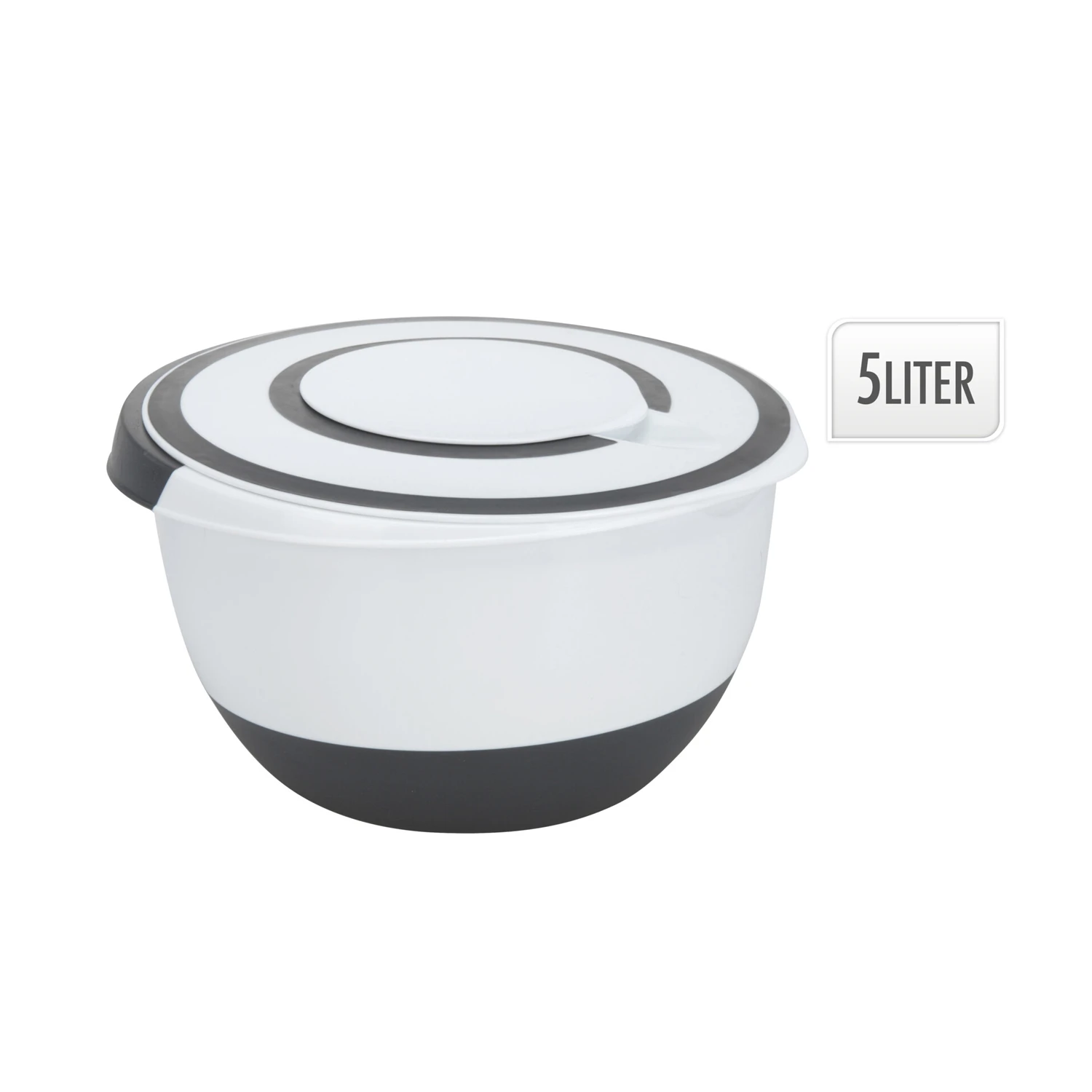 Als jij op zoek bent naar een mengkom met voldoende inhoud voor zelfs de grootste porties, dan is deze zwartwitte mengkom perfect voor jou! Met een inhoud van 5 liter hoef jij je nergens door te laten beperken. De mengkom komt met een deksel, zodat jij je gemengde ingrediënten even rustig kunt laten staan.