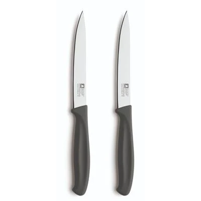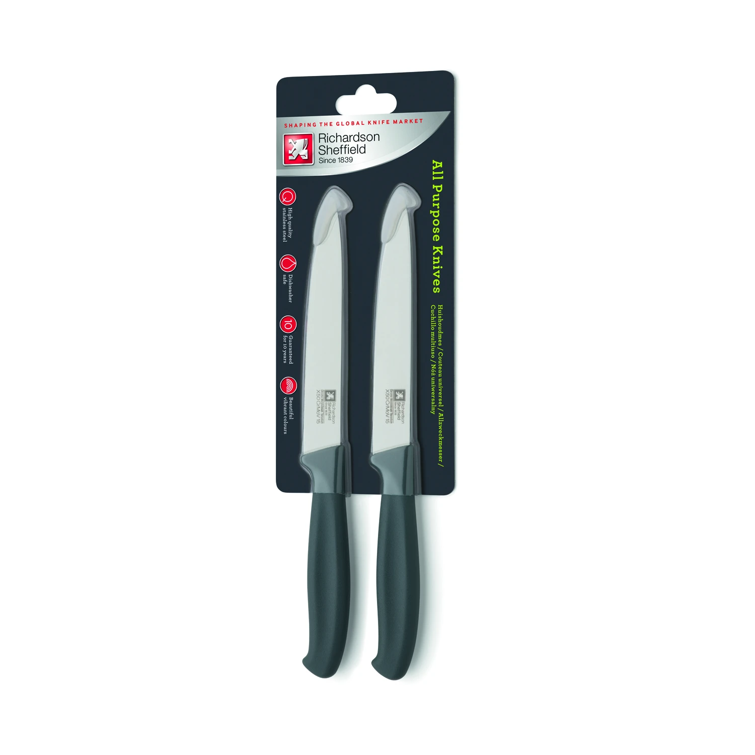 2-delige set huishoudmessen met kartel van Richardson Sheffield. Het lemmet van deze huishoudmessen is gemaakt van hoogwaardig roestvrij messenstaal, hierdoor blijft het lemmet langdurig scherp en geeft het mes veel snij comfort. De messen zijn 23 cm lang waarvan 12 cm lemmet. Het heft van de messen zijn grijs.