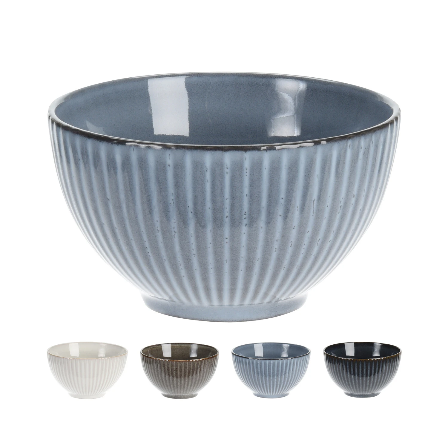 Presenteer je hapjes op een leuke manier in dit schaaltje van aardewerk. Het is gemaakt van geglazuurd aardewerk en versierd met gestreept reliëf. Het schaaltje heeft een inhoud van 600 ml en is er in de kleuren wit, grijs, blauw en donkergrijs.