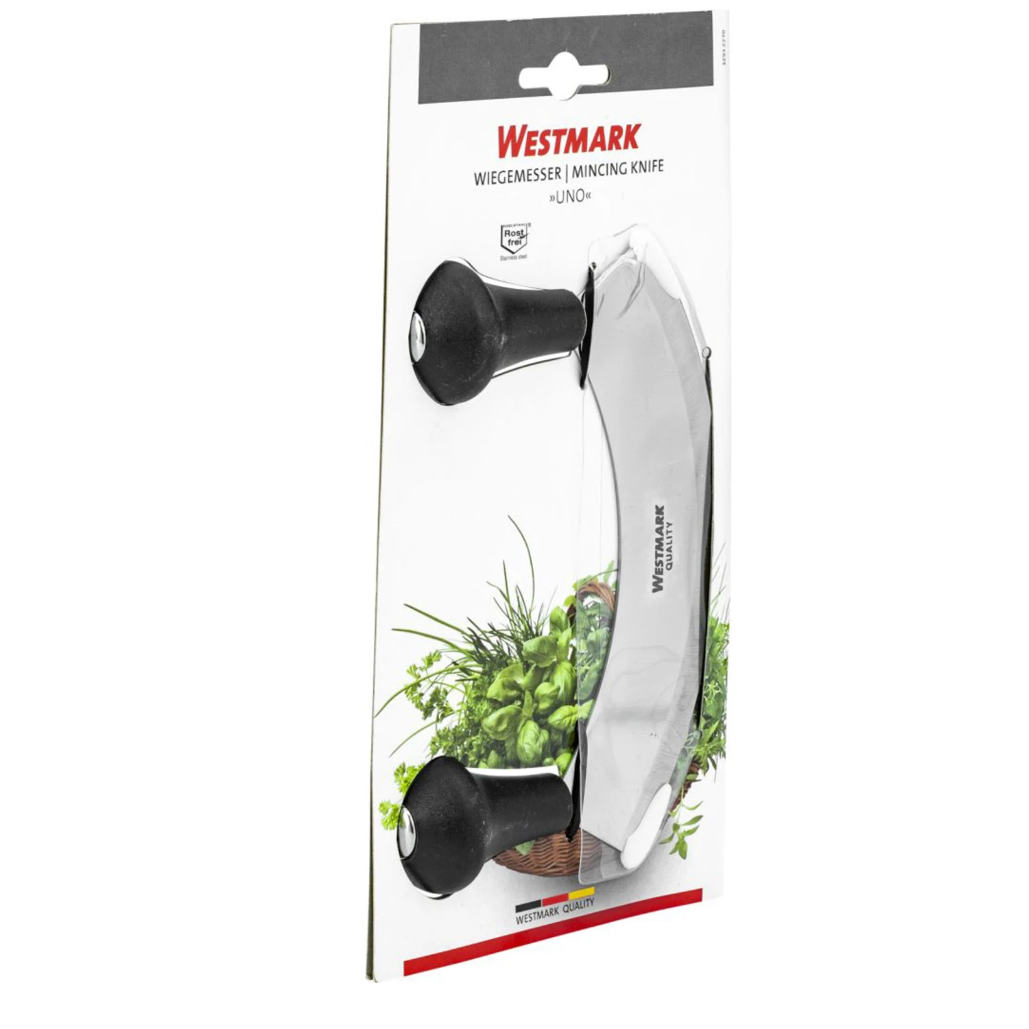 Het praktische Uno wiegemes van Westmark met enkelsnijdend lemmet is de ideale hulp bij het energiebesparend, snel hakken en snijden van verse kruiden, uien, knoflook, chocolade en dergelijke. Het voordeel hiervan is dat het snijgoed voorzichtig wordt versnipperd en niet wordt verpletterd tijdens het wiegen. Het roestvrijstalen lemmet glijdt moeiteloos en snel door de kruiden en de twee grote, antislip kogelgrepen zorgen voor de nodige grip om efficiënt te werken. Voor vers gesneden kruiden met een vol aroma!